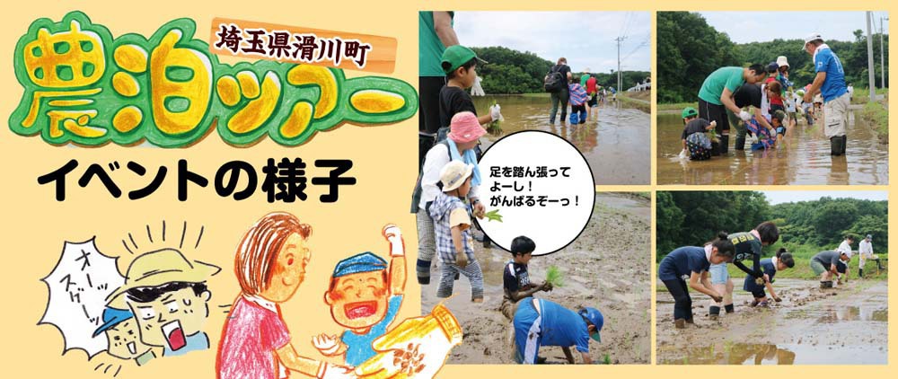 滑川町で農業体験!日帰りも宿泊もあり!田植え、稲刈り、収穫体験と1年をとおして目白押し!体験の後は花和楽の湯でゆっくり温泉にでもつかりましょう♪都心から1時間のアクセスの良い田舎で貴重な体験をしませんか?ご応募お待ちしております。